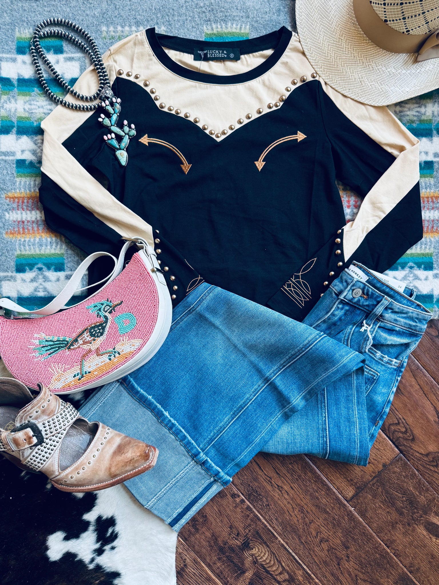 Cute western shirt with embellishments. Studs along the yoke in the front add Cowgirl chic details. Boot stitch on sleeve cuffs and back of shirt. A modern take on a western classic beige and black long sleeve shirt.